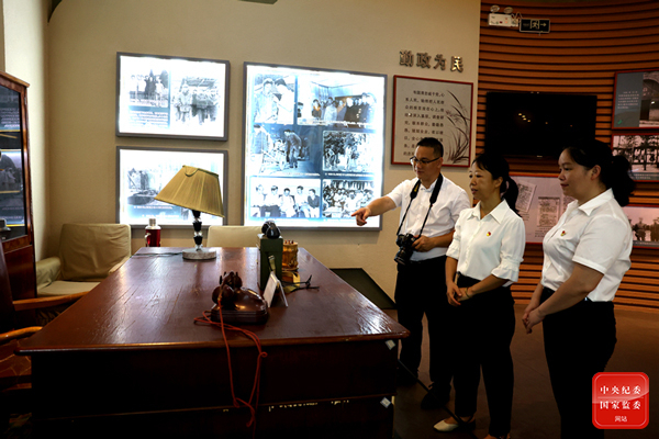 广西壮族自治区东兰县纪委监委依托当地红色资源,组织纪检监察干部参观韦国清将军廉政专题展厅。图为纪检监察干部参观韦国清将军当时的办公场所,学习韦国清将军勤政爱民、秉公办事的廉政故事。(广西壮族自治区河池市东兰县纪委监委 韦礼雄 摄)