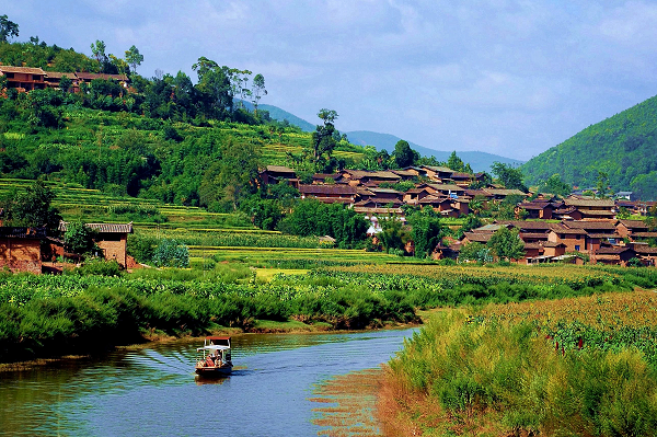 处暑时节,龙川江畔初显秋韵,两岸的农作物悄然描绘着丰收的颜色。轻舟过处,习习秋风送来阵阵稻花清香,又一个秋收季节即将到来。(丁建國 摄)