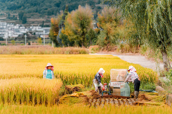 随着处暑的到来,丰收的脚步慢慢靠近。粮食成熟,秋收开始,田野间一片忙碌。(冯伯韬 摄)