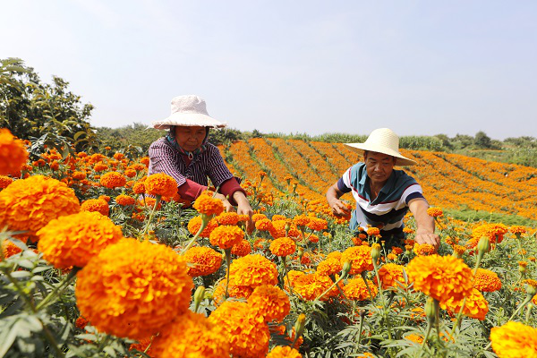 处暑时节,随风摇曳的万寿菊花将山村装点成金色花海,宜良县北古城镇安南村村民收获正忙。(易盛芳 摄)