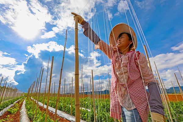 处暑时节,勤劳的农民趁着晴好天气插杆挂线,让豌豆枝条攀附生长。(王勇 摄)