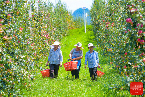 果园里,红彤彤的苹果好似小小的红灯笼挂满枝头,在阳光照耀下,果农们忙着采摘、搬运,又是一个丰收年。(贵州省桐梓县纪委监委供 杨涛 摄)
