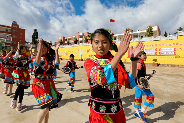 陆良县龙海乡双箐口小学的孩子们在欢快地跳着“大三弦”舞蹈。(王勇 摄)