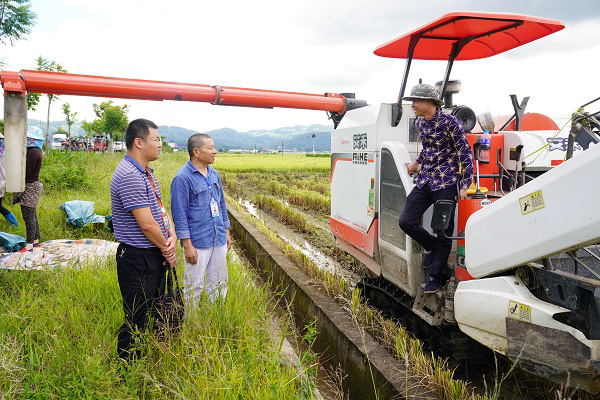 勐海县纪委监委派出纪检监察干部紧盯粮食生产各个环节,走访农户和粮食生产专业合作社开展监督检查,保障惠农政策落实。图为近日,该县纪检监察干部走访勐混镇大米生产专业合作社,了解水稻收割、产量、销售以及惠农政策落实情况。(周听维 摄)