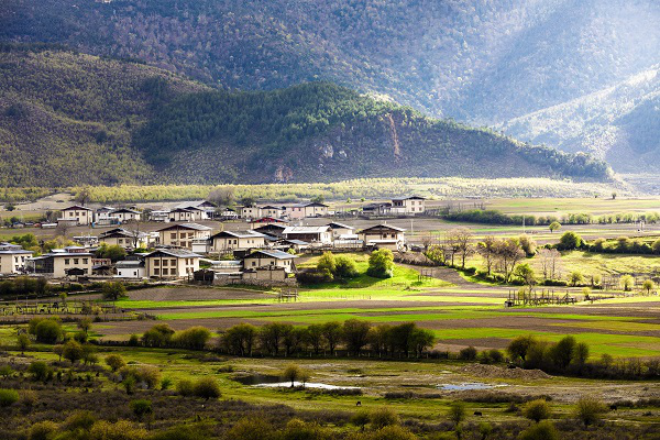 青山、绿草、民房相互辉映,充分展现了安宁市乡村优美、生态宜居的良好环境,在阳光的照耀下,宛如一幅美丽的生态画卷。(张岚 摄)
