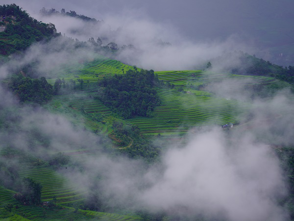 青雾缭绕高山翠,拨云登梯望高来。在金平县金河镇平安寨村,青翠的秧苗,缥缈的薄雾,若隐若现的公路,构成了一幅优美的图画。(王仲璋 摄)