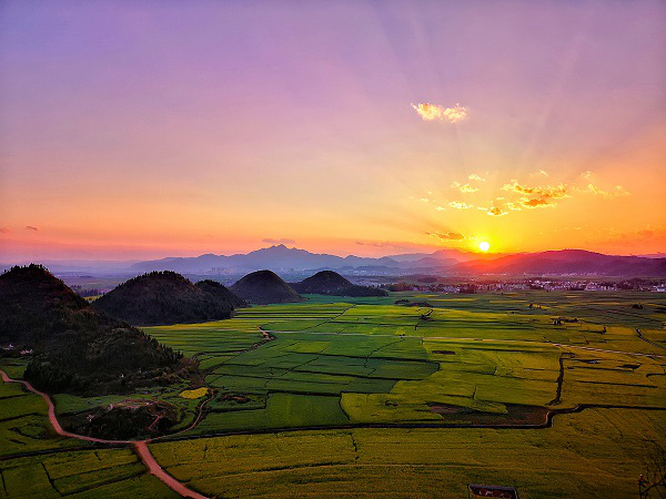 朝霞灿照,炊烟四起,花海漫山……对于腾冲市清水佤族人民来说,这就是幸福。(李恒宇 摄)