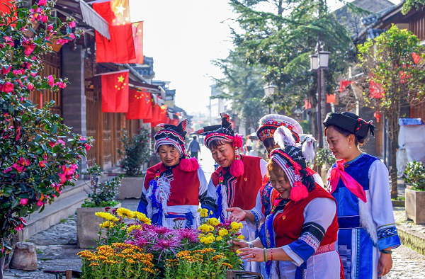 剑川古城里,傲然怒放的菊花成为一道靓丽的风景,妇女们身着节日盛装一同秋游。(苏金泉 摄)