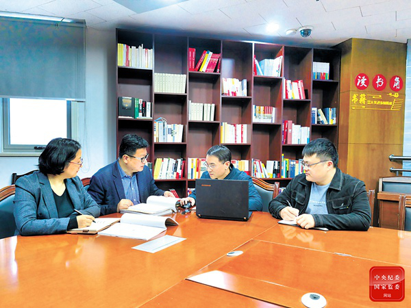 图为南京市鼓楼区纪委监委监督检查室、审查调查室、案件审理室工作人员集中研究鼓环公司案件案情。韩红华 摄