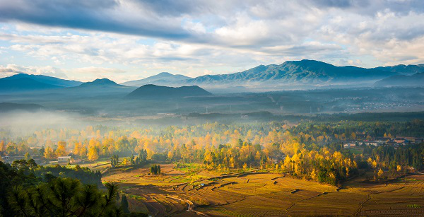 薄雾初升,远山如黛,整个村寨朦朦胧胧,恰似一幅大自然精心绘制的山水画。(李新位 摄)