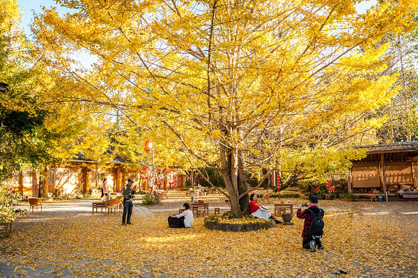 琉璃般的光线透过树叶罅隙打在满地落叶上,在这个温暖而美好的童话世界里,与家人小聚,赏美景、品美食,人生快事。(李新位 摄)