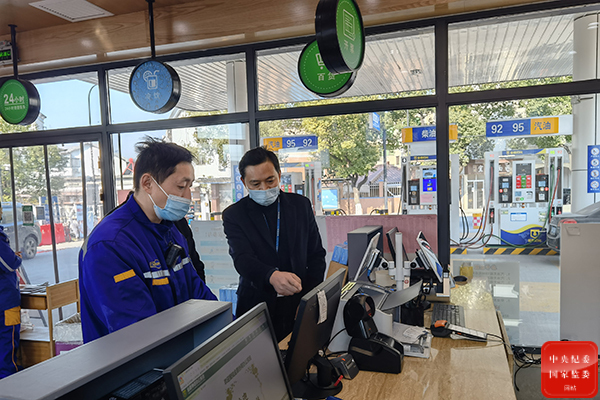 杭州市钱塘区纪委监委派驻第二纪检监察组联合新湾街道纪工委开展节日监督,前往加油站检查公车加油卡使用和公款办理加油卡情况。(杭州市钱塘区纪委监委 丁佳妮 摄)