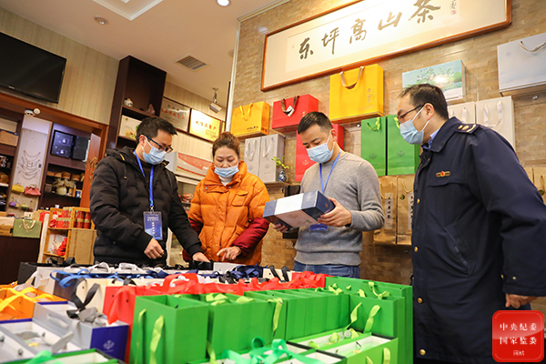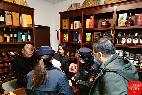 浙江省浦江县纪委监委联合相关职能部门组建“清风护航”专项检查组,深入烟酒茶叶专卖店、饭店、娱乐场所等,深挖细查是否存在违规吃喝、违规收送礼品礼金、享乐奢靡及其他隐形变异“四风”问题。(浙江省浦江县纪委监委 洪小岚 摄)