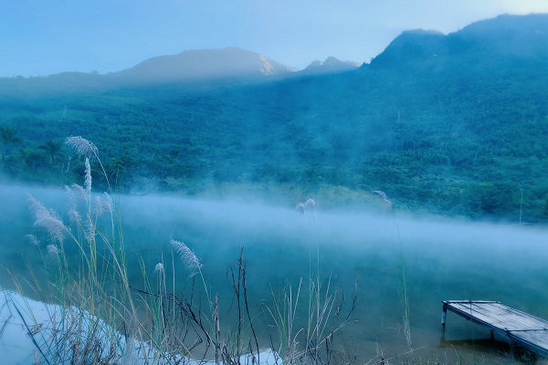 大寒时节,芒市清晨的孔雀湖银装素裹,霜花染上清寒,云雾倚靠桥面,远处山间难掩绿意。(彭璇 摄)