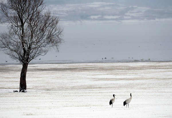 时值冰天雪地的大寒之日,皑皑白雪覆盖着远方的山,黑颈鹤漫步湖边,等待冬日的一抹暖阳。(靳岭 摄)