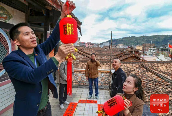 福建省莆田市仙游县盖尾镇纪委监察组制作了廉政春联和题有“廉”“洁”等字的灯笼,赠送给25个村(居)干部,提醒他们在欢度佳节的同时绷紧廉洁自律的弦。图为该镇纪检干部在前连村村干部家中悬挂“廉”字灯笼。(福建省莆田市纪委监委 吴震 摄)