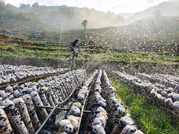 眼下正是黑木耳春管的关键时期,龙陵县龙江乡的农民们抢抓农时,一大早就给菌包浇水施肥,确保今年黑木耳增产增收。(王龙芹 摄)