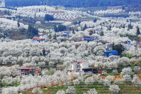 忽如一夜春风来,千树万树梨花开。美丽的村庄中,一团团梨花竞相绽放,放眼望去,山村宛如一幅绝妙的水彩画。(白云 摄)