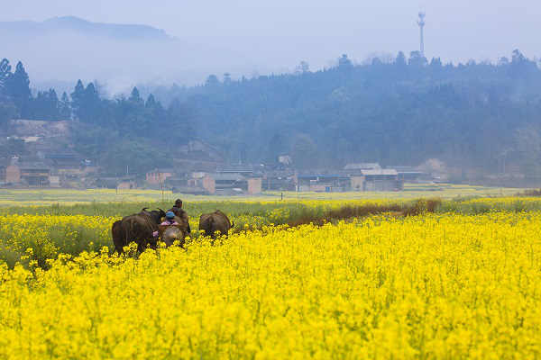 村庄外,油菜花开了。远山如黛,整个村庄朦胧在浪漫的情调里。勤劳的农民伯伯牵着大水牛,走在溢满花香的田埂上,开始播种一年的希望。(李恒宇 摄)