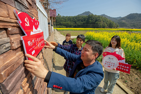 浙江省淳安县开展“建设廉洁好家风、党员干部当先锋”活动。图为近日,该县姜家镇郁川村党员干部把党员身份牌挂在自家门口,晒出家风家训。 毛勇锋 摄
