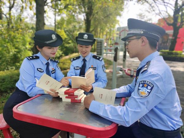 公安干警利用业余时间交流丛书学习心得。(王龙芹 摄)