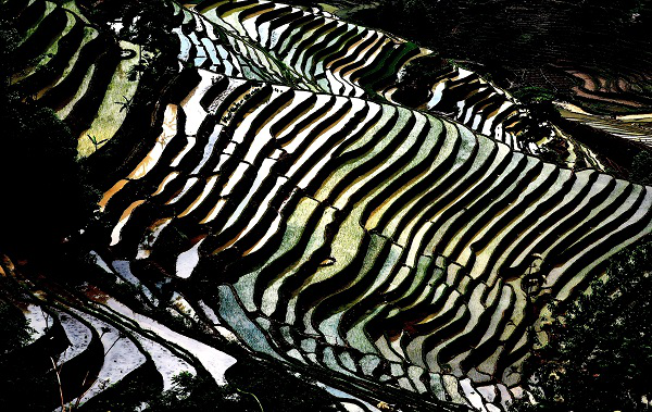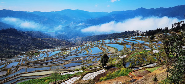 层层叠叠的哀牢梯田水波荡漾,勤劳的农人以秧为墨,在田里描绘丰收的蓝图,放眼望去像一首配了诗的水墨画,别有一番韵味。(孙庆明 摄)