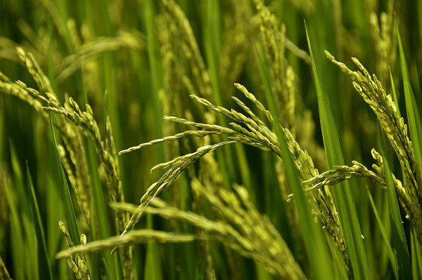 初夏,青绿稻粒开始灌浆,小得盈满,稻穗随风摇摆,似在显露丰收在望的喜悦。(陶立斌 摄)