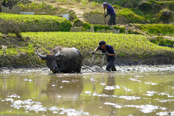 每到小满时节,涉农街道的山沟里、梯田上、田坝中随处都能看到村民们在劳作,他们赶着耕牛,或犁田或耙田,宛如一幅古老的画卷。(饶华 摄)
