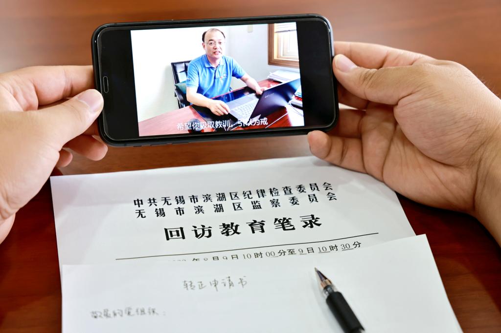 江苏省无锡市滨湖区纪委监委抓实抓细受处分人员的回访教育工作,坚持“一把钥匙开一把锁”,量身定制个性化“回访套餐”,精心选择回访时机、谈话地点、鼓励方式,教育引导党员干部正视错误、解开心结、积极履职。图为一名因受处分被延长预备期的预备党员正在观看其入党介绍人录制的暖心视频,并现场书写转正申请书。(江苏省无锡市滨湖区纪委监委供 唐清妍 摄)