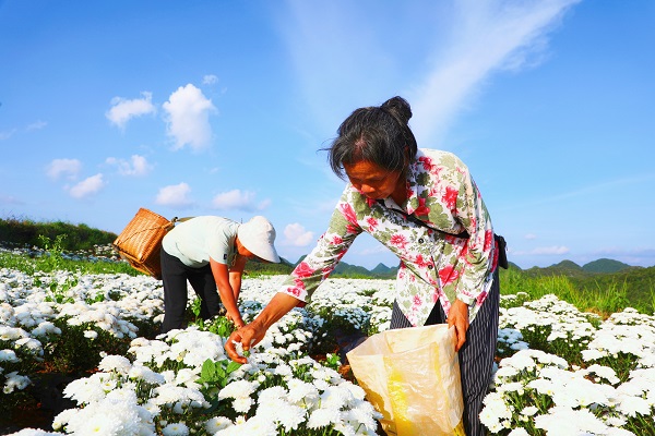 此时正是翠菊采摘的时候,雪白的翠菊如碧海中倒映的白云,像玉盘里散落的珍珠。(王铭坚 摄)