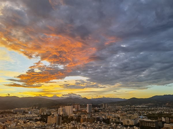 虽已处暑,暑气渐消,但天边的夕阳依然火红而热烈,晕染着天际,给这座小城披上了一件鲜艳的衣裳。(普艳华 摄)