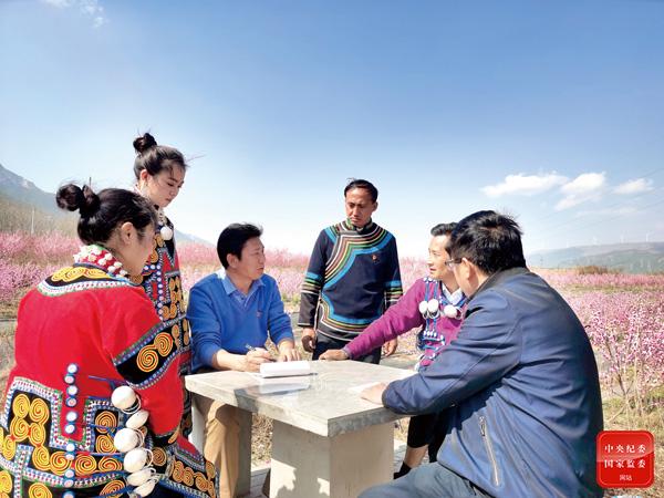 近日,凉山彝族自治州布拖县拖觉镇石咀村桃花节现场,镇纪检监察干部深入桃林,向村民通报最新“一卡通”收益中的“桃花节期间预定订单收益”,对巩固拓展脱贫攻坚成果同乡村振兴有效衔接相关政策落实,以及当地干部纪律作风建设情况进行走访。阿枝李沙 摄