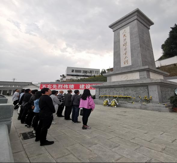 在烈士陵园中,全体党员肃穆前行,向烈士纪念碑敬献花篮,集体默哀一分钟致敬先烈,沉痛哀悼为解放事业、社会稳定流血牺牲的革命先烈。默哀结束后,机关第六支部、第七支部组织党史学习、重温入党誓词。