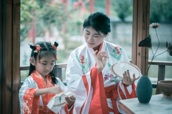 刺绣技艺在母亲和孩子的一针一线中代代传承。(何成江 摄)
