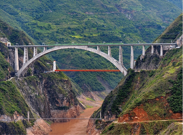 在澜沧江之上,因不同时期不同需要架起的各类桥梁在此重叠,静静地诉说着古代南方丝绸之路的历史岁月。霁虹桥、中缅油气管道、大瑞铁路桥跨江而过,展示了我们党在百年历史进程中克服了一个又一个困难,取得了一次又一次胜利,建立了新中国,坚持改革开放,到如今国富民强的场景。